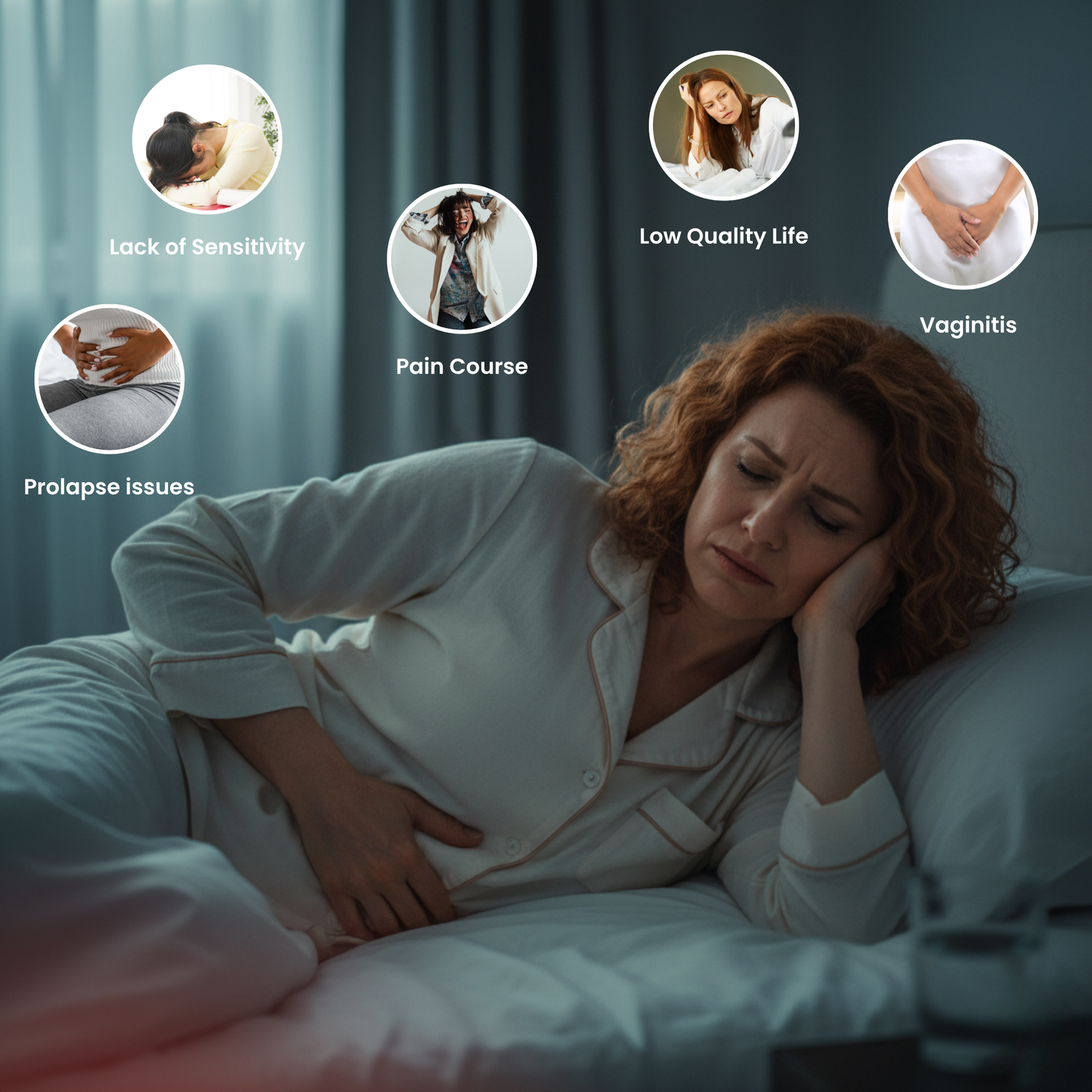 Dryness, burning, or a “paper-dry” feeling. Tenderness with touch. Less natural lubrication and sensitivity. A heavier pelvic feeling after childbirth. Even everyday things, walking, workouts, tight clothes, can feel uncomfortable. It can spill into intimacy and mood, and it’s frustrating because nothing you did “wrong” caused it.