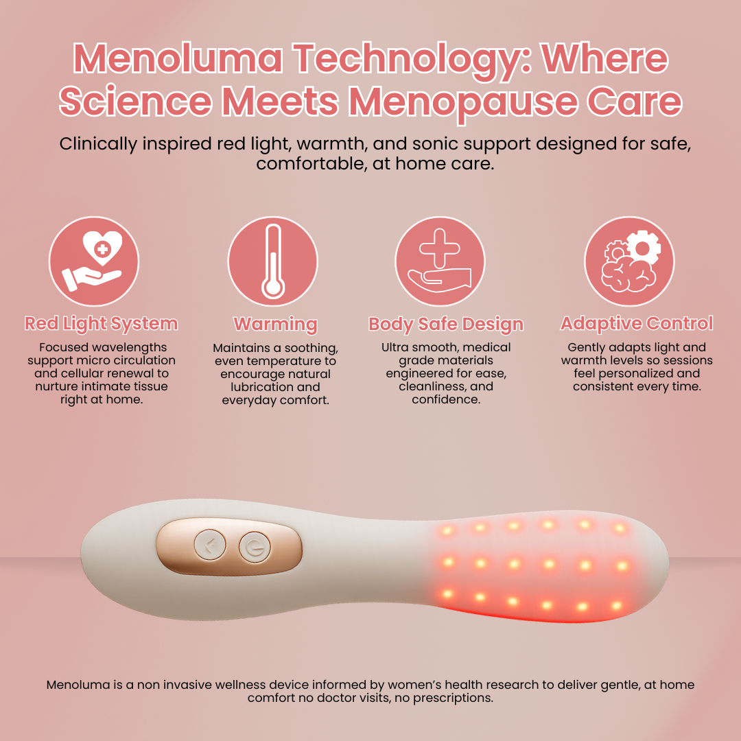 Menoluma uses warmth, red light, and Sonic Stimulation to support natural moisture and comfort.